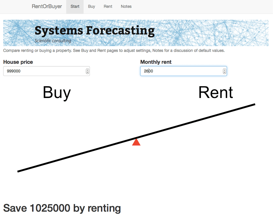 For the $999,000 house, and some perfectly reasonable assumptions for the parameters, I estimate savings by renting of about … a million dollars. Which is certainly enough to give one pause. Give it a try yourself before you buy that beat up shack!