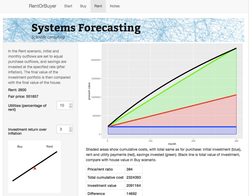 For the Rent scenario, we assume identical initial and monthly outflows. However the housing costs in this case only involve rent and utilities. The initial downpayment is therefore invested, as are any monthly savings compared to the Buy scenario. The Rent scenario therefore has the same costs as the Buy scenario, but the person ends up with an investment portfolio instead of a house. By showing which of these is worth more, we can see whether in financial terms it is better to buy or rent.