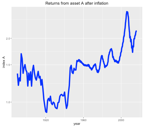 Suppose you were offered the choice between investing in one of two assets. The first, asset A, has a long term real price history (i.e. with inflation stripped out) which looks like this: